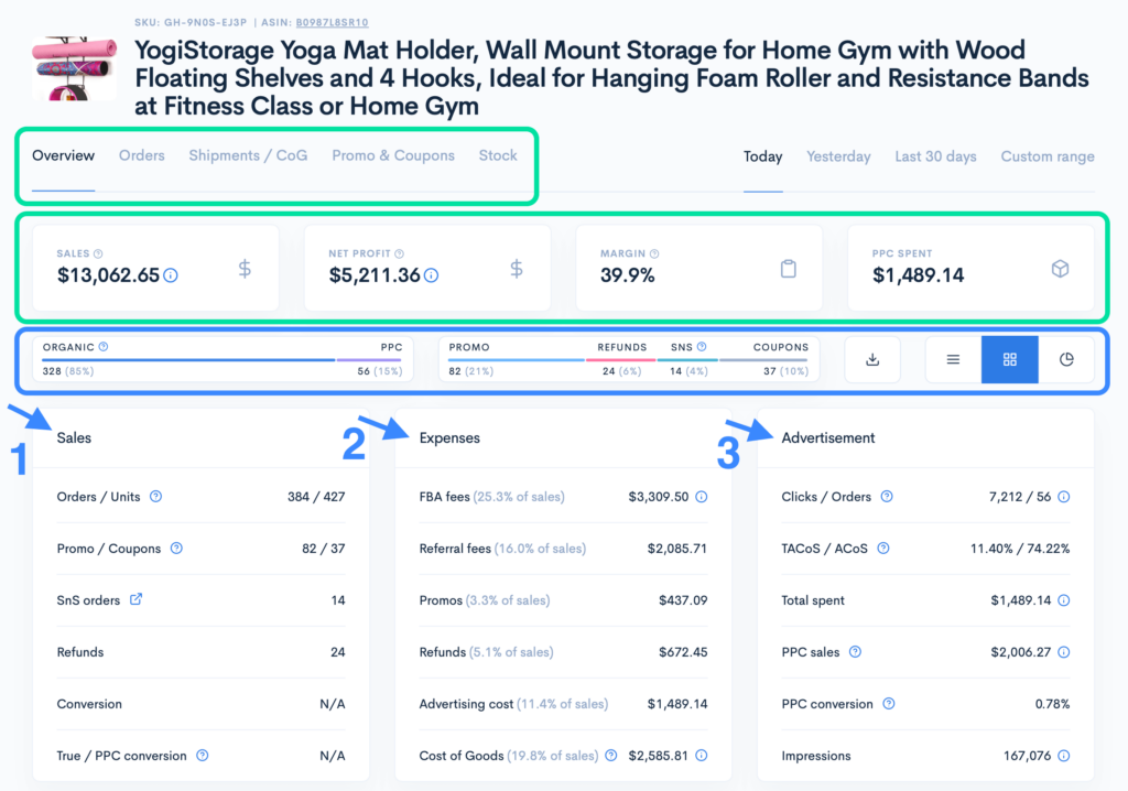 - Use Sellerise Financial Analytics to see how discounts, coupons, or FBA fees impact your real profit per session.